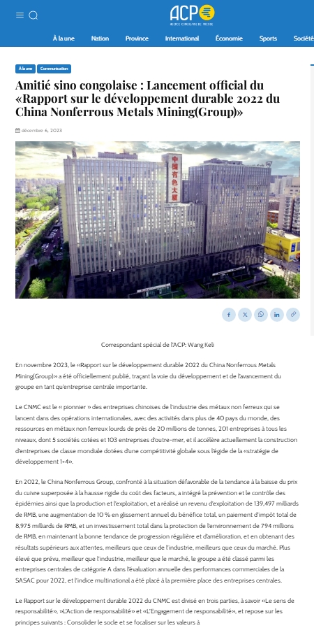 2023年12月7日,剛通社發布《中國有色集團2022可持續發展報告》,這是該社連續第二年對集團公司可持續報告進行重點宣傳。