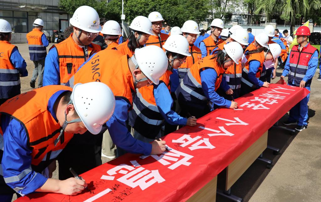 中色十五冶青年員工在“安全生產月”啟動儀式橫幅上進行簽名