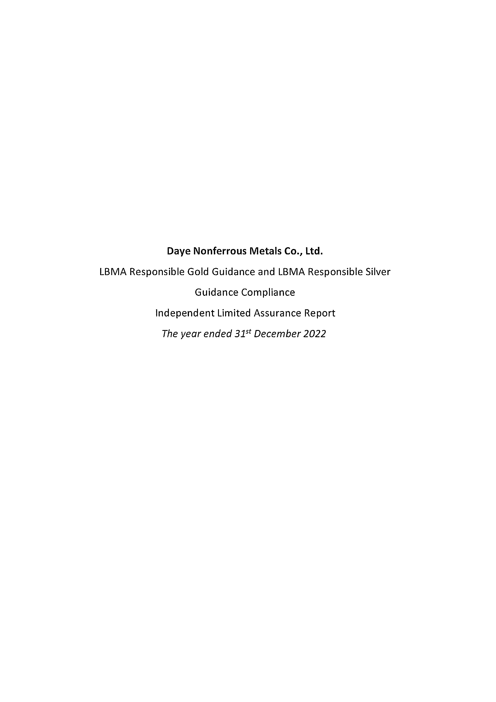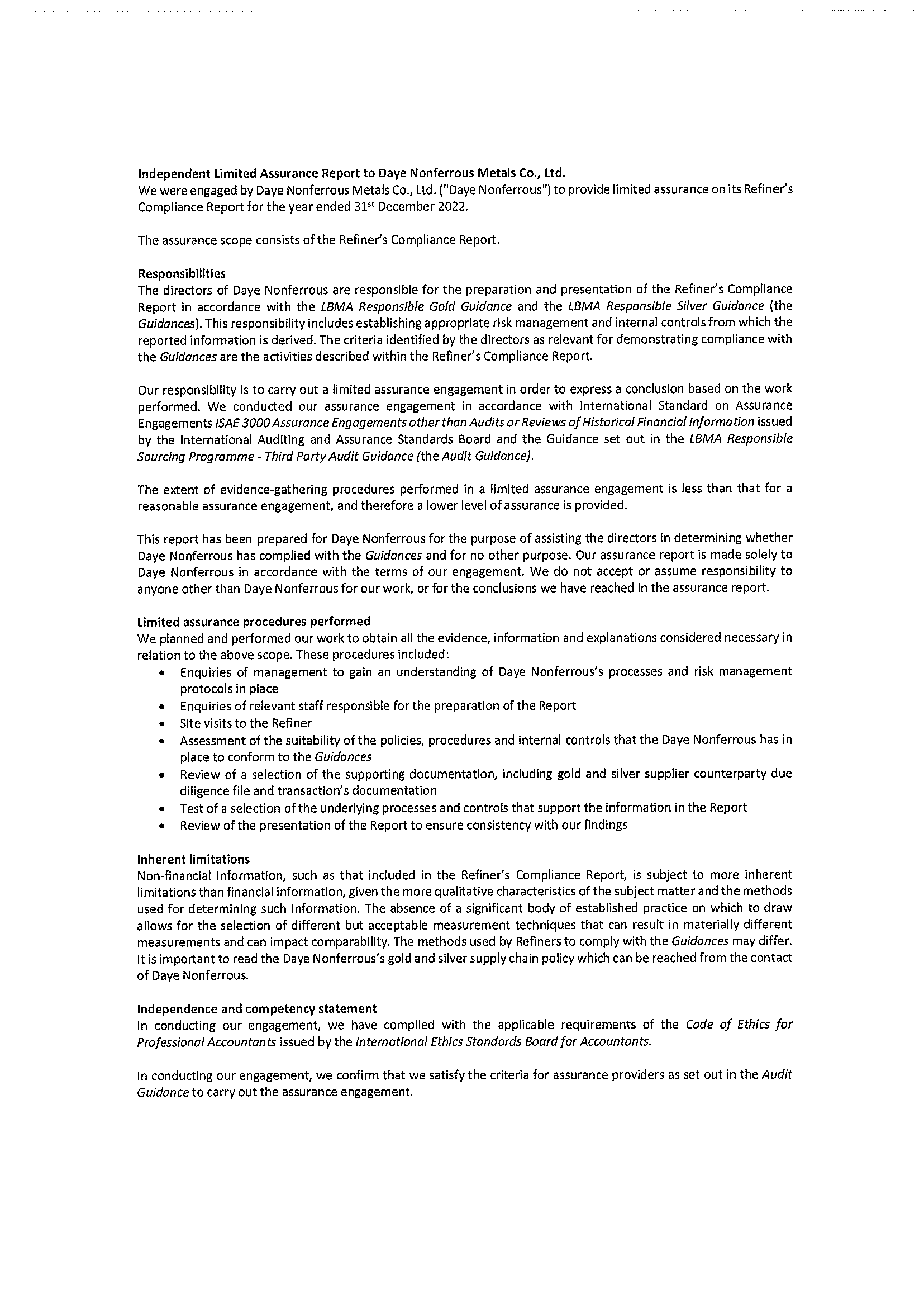 LBMA Responsible Gold Guidance and LBMA Responsible Silver Guidance Compliance Independent Limited Assurance Report